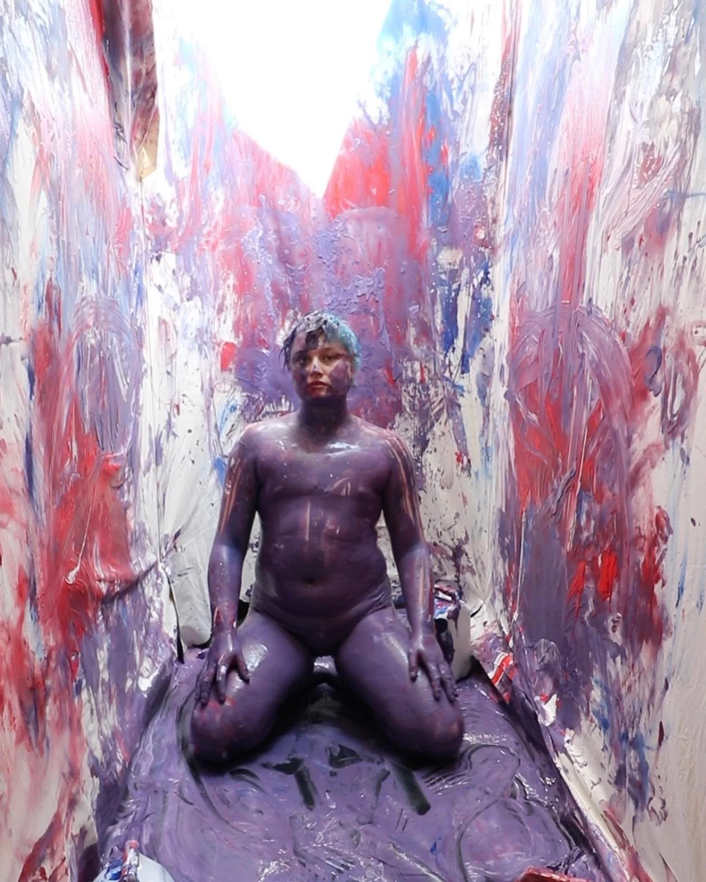 In this piece I had spent a week working on different moves destroying thy self and recreating thyself. leaning on the feminie and the masculine. this piece was 4 weeks after my top surgery. starting this piece with a plain nude trans body with white canvas leaving it with an exploded sense of chaos.
